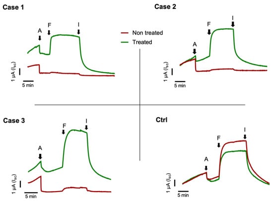 Short-circuit current (Isc) recording experiments on brushed nasal epithelial cells. Case 1 to 3 are short-circuit currents from CF patients with F508del/Unknown genotype treated with KaftrioTM. Cells were treated with (green line) or without (dark red line) a combination of VX-445 (3 μM), VX-661 (3 μM) and VX-770 (100 nM) for 24 h. The black arrows indicate: A = addition of Amiloride (100 μM) for ENaC channel activity inhibition, F = addition of Forskolin (10 μM), IBMX (3-Isobutyl-1-methylxanthine) (100 μM) for activation of the transepithelial cAMP-dependent current (including CFTR channel activity) and I = addition of Inh-172 (5 μM) for CFTR specific inhibition. All chemicals were added to the apical/mucosal side of cells.