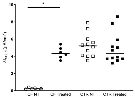 KaftrioTM effect on CFTR-dependent Cl-secretion. Isc response to FSK Forskolin (10 μM), IBMX (100 μM) (ΔIscF/I) after treatment for 24 h with DMSO (No-treated) or a combination of VX-445 (3 μM), VX-661 (3 μM) and VX-770 (100 nM) (Treated). ΔIscF/I recording experiments on brushed nasal epithelial cells from CF patients (two filters per patients, n = 3) with F508del/Unknown genotype and control subjects (two filters per subject, n = 6). CF NT: Cystic Fibrosis patients Non Treated (white circles), CF Treated (black circles), CTR NT: Control subjects Non Treated (white squares), CTR Treated (black squares). The p-values for statistically significant differences are indicated as * <0.031. In the Table 2 are presented the statistical analysis of the samples analyzed.