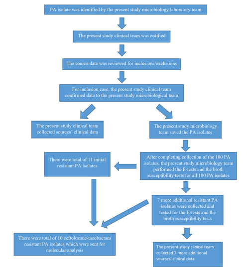 A total of 100 PA isolates which caused clinical infections were collected between January 2020 and January 2021. There was a total of 11 resistant PA isolates among the initial 100 PA isolates. Additional resistant PA isolates were collected to increase the number of resistant PA isolates between February 2021 and September 2021. There was a total of 7 resistant PA isolates which had been collected during this period. The study flowsheet is presented in Figure 1.