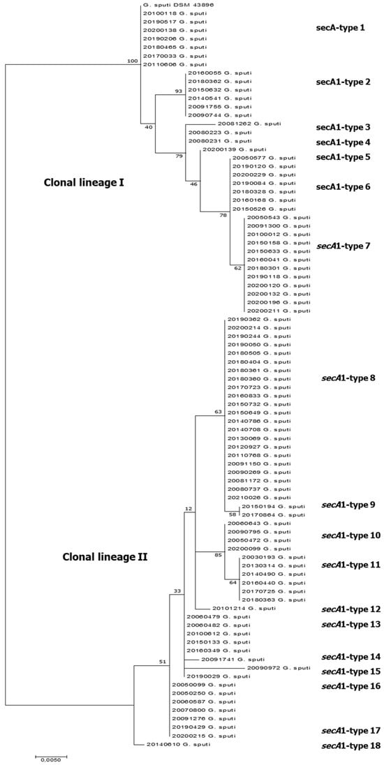 secA1 sequence-based phylogenetic tree of clinical G. sputi strains with reference G. sputi DSM 43,896 (n = 88 strains, 453 bp alignment positions) using MEGA7 []. The evolutionary history was inferred by using the Maximum Likelihood method based on the Tamura 3-parameter model with 1000 replications for bootstrap values. The optimal tree is shown. The tree is drawn to scale, with branch lengths in the same units as those of the evolutionary distances used to infer the phylogenetic tree. A discrete Gamma distribution was used to model evolutionary rate differences among sites (5 categories (+G, parameter = 0.0500)).
