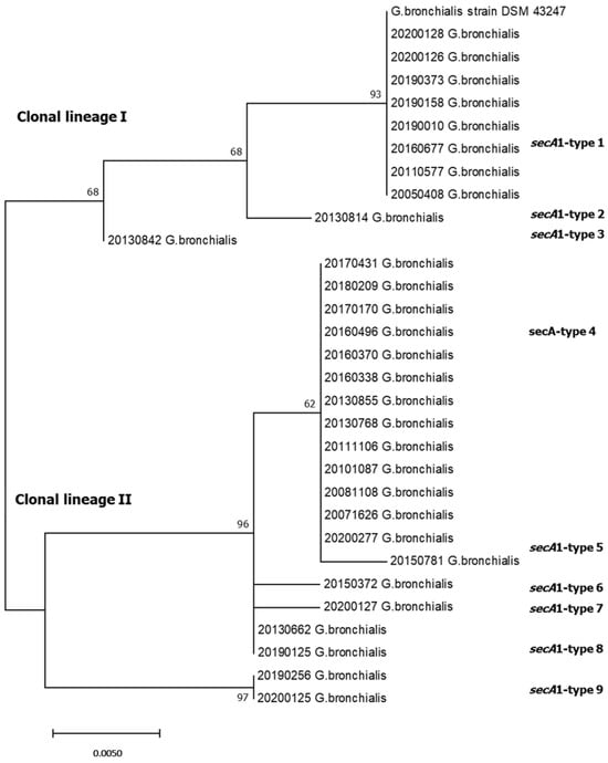 The 16S-haplotype of the reference strain was found in all G. bronchialis strains (n = 30). This is unlike the secA1 partial sequences, which showed 15 segregating sites respective to the G. bronchialis DSM 43247 strain, resulting in nine secA1-haplotypes (Table 3). Nine of these SNPs were very prevalent (≥46%) (positions 480, 507, 540, 543, 651, 672, 690, 738 and 801 respective to the complete secA1 gene of G. sputi ATCC 29,627 GenBank accession no. JAAXP0010000001). Three amino acid replacements were produced, Asp-180 → Glu, Glu-231 → Gln and Arg-258 → Gln, in 14, 21 and 2 strains, respectively. Three clonal lineages could be observed in the phylogenetic tree (Figure 3), created with the same suggested model mentioned above: clonal lineage I, represented by the strain G. bronchialis DSM 43247T with secA1-type A1 (eight strains), and types A2–A3 (one strain for each one); clonal lineage II, with the predominant secA1-type A4 (thirteen strains), and types A5–A8 (one strain for each one); and clonal lineage III, represented by type A9 (two strains). In the studied period, clonal lineage II produced double the clinical cases than other lineages. It should be highlighted that seven out of nine clarithromycin-resistant strains belonged to clonal lineage II (n = 18).