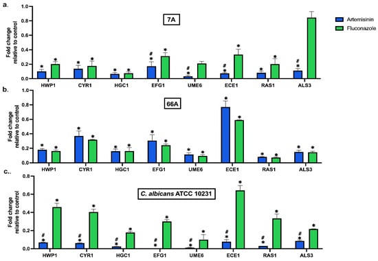 Effect of artemisinin on the expression of biofilm-related genes in strain (a) 7A, (b) 66A, and (c) C. albicans ATCC 10231. 18S ribosomal RNA was used for normalization of gene expression levels. Values are expressed as mean ± SEM, * p < 0.05, significantly different from the control; # p < 0.05, significantly different from the fluconazole.