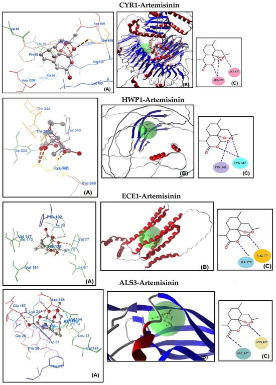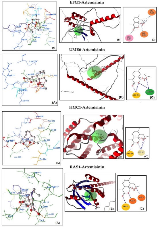 Molecular association of artemisinin with EFG1, UME6, HGC1, RAS1, CYR1, HWP1, ECE1, and ALS3 in C. albicans ATCC 10231. Each graph shows (A) molecular binding mode (dashed thick orange line, hydrogen bonds; unbound amino acids, steric interactions); (B) 3D interaction docked pose view (green area: active site); (C) two-dimensional representation of hydrogen bonds made by artemisinin and related protein.