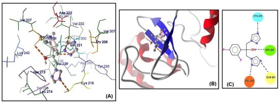 (A) Molecular binding mode of EFG1 and FLC (dashed thick orange line, hydrogen bonds; unbound amino acids, steric interactions); (B) the 3D interaction docked pose view (green area: active site); (C) two-dimensional representation of hydrogen bonds made by FLC and EFG1.