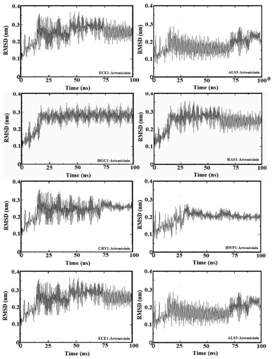 The stability of artemisinin with selected C. albicans genes during MD simulations is confirmed by the RMSD (root means square deviation) plot. The binding behavior of artemisinin was further analyzed using the GROMACS 2020 software []. The chosen receptors were then subjected to a 100 ns MDS analysis. All of the complex systems were solved with TIP3P water molecules, and sufficient amounts of Na+ and Cl were added to the systems to achieve a salt concentration of 0.15 M. The CHARMM36 force field was applied in all of the simulations []. After minimization of the whole system, the temperature was slowly adjusted to 310 K, which is close to the physiological temperature of the human body (37 °C). Production runs of the MD simulation were then carried out for 100 ns without any structural constraints.