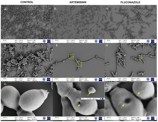 FESEM images of C. albicans ATCC 10231 biofilms after control and 24 h exposure to artemisinin and fluconazole. (A–C). Untreated biofilm culture. (D–F). Biofilm culture treated with 640 μg/mL artemisinin. (G–I). Biofilm culture treated with 4 μg/mL fluconazole. Magnification scales of 500×, 2000×, and 50,000× were used for imaging. Arrows indicate unusual surfaces and pore formation. The frame shows the selected region.