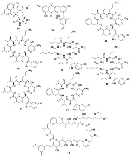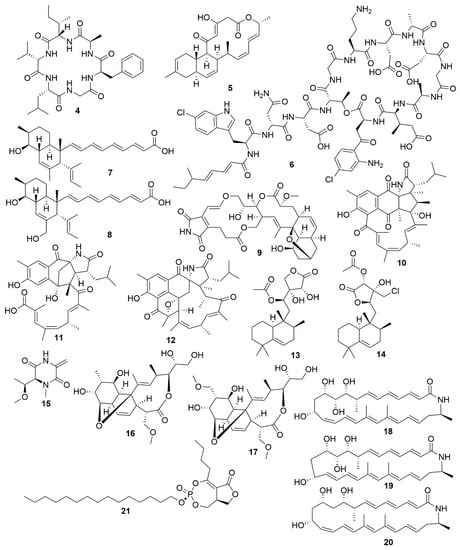 Bacteria are promising sources for novel antimicrobial natural product discovery. This is primarily due to two factors. One is their variable and malleable metabolism [] and the other is their competitive pressure for resources against other microbes. Several recent examples of natural products from marine bacteria are provided below. The novel molecule bacicyclin (4) (Figure 2), which is a cyclic peptide, was isolated from a Bacillus sp. strain BC028 isolated from the common mussel (Mytilus edulis) []. It displays antibacterial activity against E. faecalis and S. aureus with minimal inhibitory concentration (MIC) values of 8 and 12 µM, respectively, and can help in the design of analogues with increased antibiotic efficacy []. Anthracimycin B (5), a polyketide with powerful anti-Gram-positive bacteria activity that was obtained from a marine-derived Streptomyces cyaneofuscatus M-169, has expanded the knowledge of how the methyl group at C-2 of anthracimycins plays a role in its antibacterial effect []. Taromycin B (6), a lipodepsipeptide with potent activity against methicillin-resistant S. aureus and vancomycin-resistant E. faecium which was isolated from the marine actinomycete Saccharomonospora sp. CNQ-490, provides a promising start for the development of novel antibacterial scaffoldings []. Janthinopolyenemycin A (7) and B (8) are also polyketides and the first examples of molecules of their structural type. Janthinopolyenemycins were isolated from the proteobacterium Janthinobacterium spp., strains ZZ145 and ZZ148, and have activity against Candida albicans []. Streptoseomycin (9), a macrolactone isolated from the actinobacterium Streptomyces seoulensis A01, has specific activity against microaerophilic bacteria, specially the pathogen H. pylori []. This restricted activity makes streptoseomycin a good starting point for the discovery of antibiotics for the treatment of H. pylori infections. The polyketides ansalactams B (10), C (11) and D (12) are highly modified ansamycins that show weak and mild anti-methicillin-resistant S. aureus and were identified in cultures of Streptomyces sp. CNH189, isolated from marine sediments. Ansalactams B and D are cyclic polyketides with similarities to ansalactam A. However, ansalactam D shows evidence of an uncommon oxetane ring. Ansalactam C is an open polyketide chain resulting from a Baeyer–Villiger-type oxidation []. Micromonohalimanes A (13) and B (14) are rare halimane-type diterpenoids isolated from the actinobacterium Micromonospora sp. WMMC-218. Micromonohalimane A displays a very weak inhibitory effect on methicillin-resistant S. aureus while micromonohalimane B displays moderate bacteriostatic activity against it. Xestostreptin (15) is a modified diketopiperazine isolated from Streptomyces sp. S.4, resulting from the condensation of the aminoacids threonine and alanine []. Xestostreptin shows weak activity against the malarial agent P. falciparum. Two macrolides, branimycins B (16) and C (17) were identified from a fermentation of the actinobacterium Pseudonocardia carboxydivorans M-227, isolated from deep sea water []. Branimycin B shows moderate antibacterial activity against Gram-positive bacteria, while branimycin C displayed moderate antibacterial activity against Gram-negative bacteria.