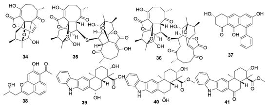 A number of examples of marine bacterial natural products with antiviral bioactivities have been recently reported. Three novel abyssomicin monomers, neoabyssomicins D (34) (Figure 4), E and A2 and two dimers—neoabyssomicins F (35) and G (36)—were isolated from the marine Streptomyces koyangensis SCSIO 5802, with neoabyssomicin D showing moderate anti-herpes simplex virus activity, and neoabyssomicins F and G showing low activity against vesicular stomatitis virus []. Streptomyces sp. OUCMDZ-3434, isolated from the marine alga Enteromorpha prolifera, was shown to produce five new phenolic polyketides []. Of these molecules, wailupemycin J (37) and (R)-wailupemycin K (38) proved to be bioactive against the influenza A virus (H1N1). The indolosesquiterpenoids xiamycins C (39), D (40) and E (41) were isolated from the marine-derived Streptomyces sp. #HK18, and showed strong inhibitory effect against the coronavirus porcine epidemic diarrhoea virus []. As such, xiamycins may provide useful leads in the development of antivirals with broader spectrum activity against other coronaviruses.