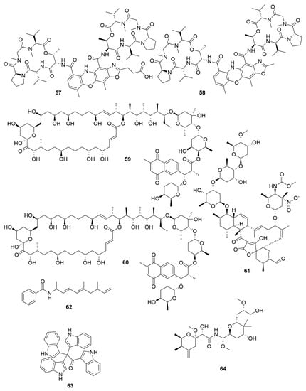 Two new chromodepsipeptides, neo-actinomycin A (57) (Figure 6) and neo-actinomycin B (58) were isolated from a marine-derived Streptomyces sp. IMB094 []. They showed strong cytotoxic effect on human colorectal carcinoma cell line HCT116 and human lung carcinoma cell line A549.