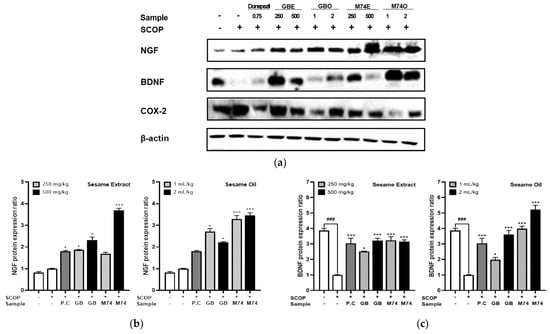 Growth or trophic factors, such as brain-derived neurotrophic factor (BDNF) and nerve growth factor (NGF), have neurogenic and neuroprotective effects []. Recent studies in animal models have reported that NGF deprivation causes AD-like pathologies, such as Aβ accumulation, tau hyper-phosphorylation, and synaptic dysfunction, and that NGF treatment can reverse these pathological changes []. BDNF is also essential for neurogenesis, neuroprotection, and synaptic plasticity []. Low BDNF mRNA and protein levels are observed in post-mortem AD brain tissues []. BDNF gene expression is regulated by extracellular signal-regulated protein kinase (ERK, a signaling molecule in the MAPK pathway) and cAMP response element binding protein (CREB, a transcription factor and downstream signaling molecule of ERK) []. CREB signaling is associated with memory augmentation, and disruption of CREB activity interrupts this process []. In this study, scopolamine administration decreased BDNF protein expression in mouse brain tissue compared to that in the controls. However, these alterations were attenuated by the positive control (donepezil), sesame extract, and oil pretreatment (Figure 6a–c). This study discovered that scopolamine treatment decreased NGF and BDNF expression in brain tissue compared to the control, whereas the administration of sesame extracts and oil from the lignan-rich cultivar (‘Milyang 74’) significantly increased NGF (sesame extracts and oil, p < 0.0001) and BDNF (sesame extracts, p < 0.05; sesame oil, p < 0.0001) expression by up to 2.3 times compared with sesame extracts and oil from the general sesame cultivar, ‘Goenback’. Recent studies show that the loss of BDNF or the ‘neurotrophic hypothesis of expression’ is an essential theory, and various lignans (including sesamin) upregulate neuronal regeneration factors. Sesamin improves BDNF and NT3 expression in the hippocampus of stress-induced mice [], which might be partly explained by its beneficial effects on depressive-like behaviors. The interaction of sesamin treatment and stress factors had significant effects on the mRNA expression of BDNF and neurotrophin 3 (NT3). NT3, NT4, and NGF are a group of neurotrophic factors of the NGF family that exhibit activity on certain neurons of the peripheral and central nervous systems []. Therefore, we postulated that lignan-rich cultivars with high amounts of sesamin and sesamolin upregulate the expression of proteins related to neuronal regeneration (such as BDNF and NGF) in the brain tissue compared to general sesame cultivars, resulting in improved cognitive performance.