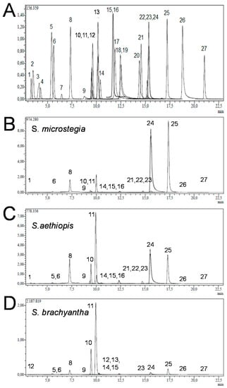 All plant samples were collected from their natural habitats by Dr. Omer Kilic. The first plant material, S. brachyantha was collected from the vicinity of Saban village (Bingöl) from rocky slopes, on 18 May 2014, at an altitude of 1400–1500 m, collection number; 5681. The second plant material, S. aethiopis was collected south of Yelesen village, from stony areas, on 20 June 2013, at an altitude of 1600–1700 m, collection number; 4780. The third plant material, S. microstegia was collected from east of Dikme village, from steppe and moist areas, on 5 September 2013, at an altitude of 1750–1800 m, collection number; 5405. All plant samples were identified by Kilic with Flora of Turkey and the East Aegean Islands []. The voucher specimens were deposited at the Department of Park and Garden Plants, Bingol University and Yıldırımlı Herbarium from Ankara. The samples were taken from the aerial parts of whole plants. The aerial parts of the studied samples were dried in a shady and airy place, held for one week.