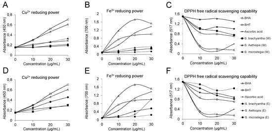 FRAP assay was used to measure the ferric ion (Fe3+) reducing capacity of the samples (Figure 2B). The overall results showed that all samples from both extraction solutions showed lower ferric ion reducing capacity than standard synthetic antioxidants (Figure 2B,E). The ethanol extract of S. aethiopis showed higher reducing power at a concentration of 30 µg/mL, the same as BHT. Similarly, S. verticillata has been previously shown to have a reducing activity less than synthetic antioxidant compounds (BHA and BHT) []. It was also shown that Salvia species could have different ferric ion reducing activities that could be classified as good, moderate, and poor antioxidant activity depending on the habitat in which they had been grown [].