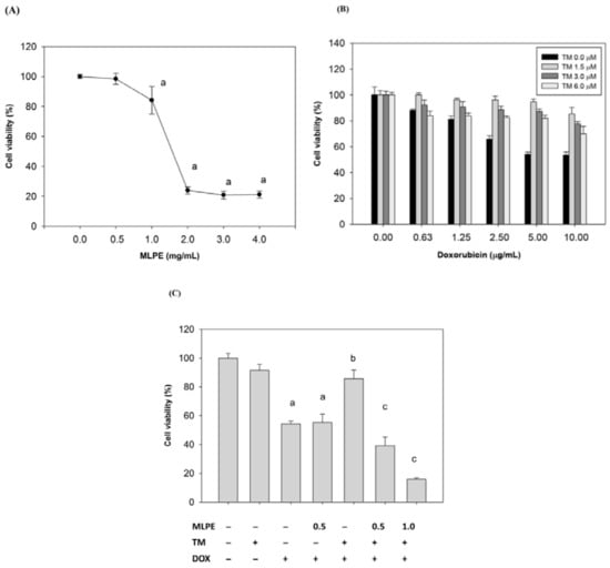 We initially investigated the cytotoxicity effect of DOX or MLPE on HCC cells (HepG2 cells) using the MTT assay. The viability of HepG2 cells was assessed using various concentrations of MLPE (0.5, 1.0, 2.0, 3.0, and 4.0 mg/mL) and DOX (0, 0.63, 1.25, 2.5, 5.0, and 10.0 µg/mL) for 24 h. As shown in Figure 1A,B, both MLPE and DOX treatment reduced cell viability (1.57 mg/mL and 10 µg/mL IC50, respectively) in HepG2 cells.