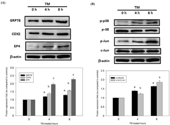 TM treatment induced the endoplasmic reticulum (ER) stress-related protein expression in doxorubicin-induced cells. HepG2 cells were treated with 1.5 μM TM for 0 (control), 4, and 8 h. Equal protein amounts of cell lysates were subjected to Western blotting using a specific antibody as described in the Materials and Methods section. (A) COX-2, GRP78 (a hallmark of ER stress), and EP4 were assessed through Western blotting. (B) p38/Jun pathway and (C) PI3K/Akt pathway were assessed through Western blotting. β-actin in the same HepG2 cell extract was used as an internal control. Optical density reading values of the specific protein versus the loading control protein β-actin are represented as fold of the control values. a, b, c, p < 0.05, compared with HepG2 cells alone.