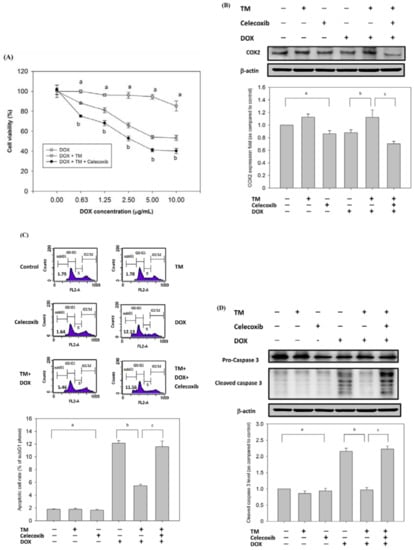 To confirm that COX-2 enhanced DOX-induced apoptosis, HepG2 cells were pretreated with TM in the presence or absence of celecoxib, a selective COX-2 inhibitor, for 8 h and then exposed to DOX for 24 h. Cell viability was determined using the MTT assay. Celecoxib significantly enhanced cell toxicity when cells were copretreated with TM (Figure 3A). The protein expression of COX-2 was inhibited by celecoxib in HepG2 cells (Figure 3B). Apoptosis was also detected through Western blotting and quantified through flow cytometry. Copretreatment with celecoxib and TM significantly increased the percentage of the subG1 phase and the level of cleaved caspase-3 (Figure 3C,D).