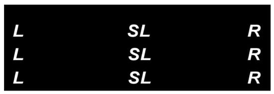 As shown in Figure 2, we designed a novel user interface in our previous [], where L, R, and S (including SL and SH for switching to low and high speeds, respectively) represent turning left and right and switching speed commands. In the interface, nine letters are distributed in a 3 × 3 matrix, and every three of the same letters denote one type of command. These nine letters flash sequentially in a random order every round, similar to the odd-ball P300 paradigm [,]. Each round refers to a flashing cycle of the nine characters, in which each letter flashes and lasts for 120 ms only once. The interval between two consecutive letter flashings is set to zero in the paradigm. Thus, the time period for one complete round is 1.08 s (120 ms × 9).