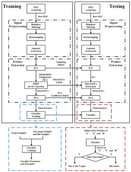 Figure 3 shows the signal flow chart of the command decoding algorithm. The flow chart includes both the training and testing phases. Each phase includes signal preprocessing, feature extraction, and classification. In the training phase, after the EEG signals were collected, the unmixing matrix of ICA, labels of optimal ICs selected by using ISFFS, transformation matrix of PCA, parameters of the classifier, and threshold were determined for online command decoding. In the testing phase, all of the trained parameters are utilized to decode the desired command from EEG signals for real-time control of a vehicle.