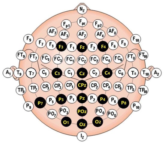 Channels used to collect EEG signals were marked in black disks with yellow text.