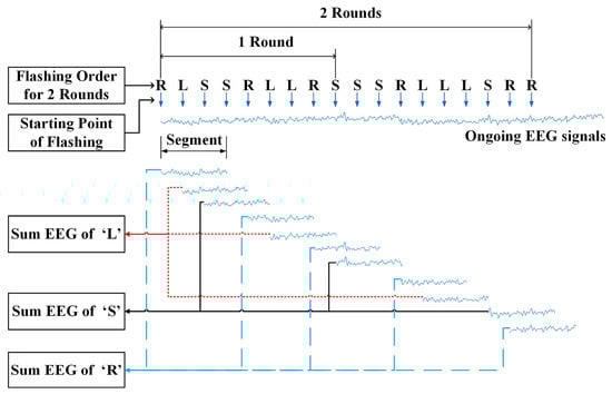 Intuitively, the total flashing repetition number of every command (i.e., L, S, or R) is three in one round and six in two rounds because every three of the same letters denote one type of command. However, in some random flashing sequences, two or all of the three same characters corresponding to one command in a round may successively flash in a single round. On the basis of the findings in [,,], in case the stimulus onset asynchrony (SOA) is less than 500 ms, an attention blink occurs. Therefore, for a command in these flashing sequences, only the first corresponding flashing character may catch the user’s attention, and the last one or two may not. Therefore, compared to traditional paradigms, the segmentation and summation rule of the continuous EEG data needs to be modified to avoid extracting useless information (for more detail, see Section 2.3.1).
