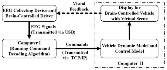 Vehicles controlled directly by brain signals rather than using limbs are called brain-controlled vehicles []. Brain-controlled vehicles can provide an alternative or novel way for individuals with severe neuromuscular disorders to expand the scope of their life activities and thus enhance their quality of life. Brain signals-based driver–vehicle interfaces (DVIs), which are responsible for translating brain signals into driving commands, are the core part of these brain-controlled vehicles. Compared to DVIs based on eye tracking [,,] and speech recognition [,,], brain signals-based DVIs do not need speech input and have low or no requirements in terms of neuromuscular control capabilities. Therefore, they are especially desirable for severely disabled people (or wounded soldiers on battlefields) to operate a vehicle. Even for healthy drivers or special service drivers, such as military vehicle drivers, brain signals-based DVIs could represent a new form of driving assistance. For example, soldiers can use such DVIs to perform a secondary task (e.g., turning on/off a device), while they need to use limbs to control a vehicle and cannot free their limbs to perform a secondary task [,,]. Thus, brain signals-based DVIs have important value for military and civil applications.