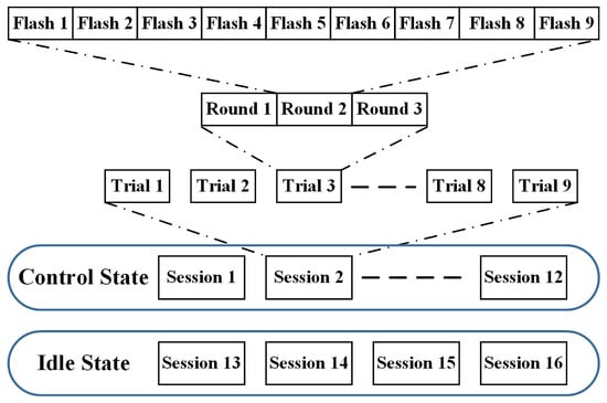 As shown in Figure 7, the data collection consisted of two phases: the first phase for control states (target and nontarget samples) and the second phase for idle states. After twelve sessions were completed for control command data collection, four sessions were conducted for idle state data collection. Each session included nine trials, and every trial included three rounds. In the first phase, the subjects concentrated their visual attention on the user interface and counted the flashing number of the predefined target letter immediately every time it flashed during the trials until the session was concluded. In the second phase, subjects were asked not to attend to any characters in every session while the user interface worked all the time. A few minutes were permitted for the subjects to rest between two consecutive sessions for each phase.