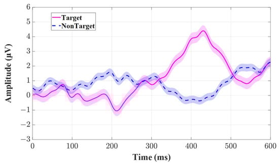 Figure 8 shows the ground-average EEG responses across all the participants to the target and non-target stimuli at channel Cz. The horizontal axis represents the time from the onset of the flashing to the post-stimuli 600 ms, and the vertical axis represents the amplitude of the EEG signals. The red solid line denotes the EEG wave morphology elicited by the target stimuli, and the blue dashed line denotes the EEG wave morphology elicited by the non-target stimuli. The shadow areas around the lines represent the standard errors corresponding to the sampling time point. We can see that the amplitude of EEG wave morphology ranged from −2 μV to 5 μV. The typical P300 component is elicited with an evident positive going wave at about 420 ms, and the N200 component is also elicited near 200 ms. Both components are present in the EEG response to the target stimuli, yet they are absent in the EEG response to nontarget stimuli.