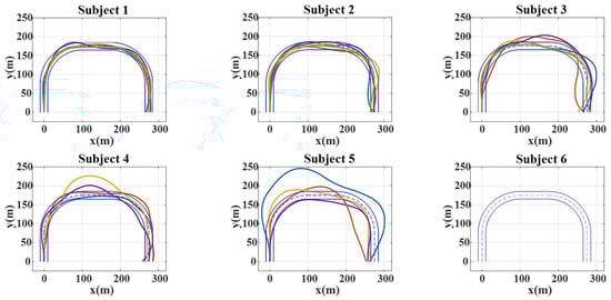 Figure 9 shows the trajectories of the brain-controlled vehicles based on the proposed DVI in the five consecutive runs for each subject. The two solid blue lines represent the road boundaries. Other color lines represent the vehicle trajectories of the successful tasks. Subjects 1, 2, and 3 achieved good performance in brain-controlled tasks, and they completed all five runs. Subjects 4 and 5 did not perform as well as Subjects 1, 2, and 3 and completed only four out of five runs. Subject 6 exhibited the worst performance and did not complete any of the runs. The task completion times of the subjects were 250.01 ± 2.79 s, 253.21 ± 1.68 s, 263.20 ± 3.17 s, 261.97 ± 5.64 s, and 265.33 ± 19.98 s and the mean lateral errors were 2.43 ± 0.48 m, 4.21 ± 0.92 m, 8.85 ± 2.05 s, 9.09 ± 1.91 s, and 18.2 ± 5.37 s, respectively. Subject 1 performed the task best of all subjects with the lowest mean lateral error and the lowest mean task completion time of about 250 s, which is close to the ideal task completion time of 245 s. Other subjects, especially Subjects 5 and 6, performed poorly.