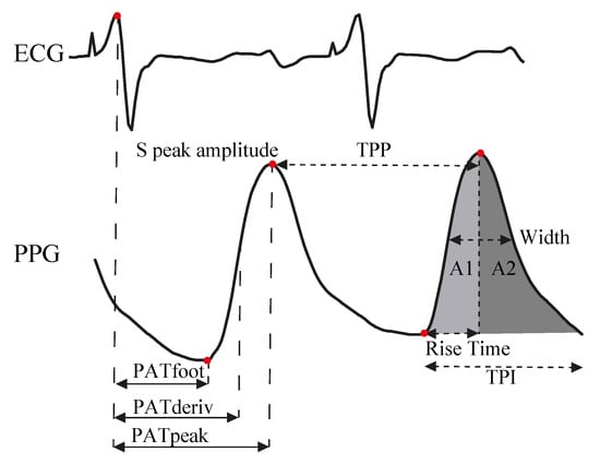 - In addition to PPG and ABP signals, the ECG signal is a prerequisite, as it plays a critical role in the extraction of pulse arrival times (PAT), a pivotal discriminant feature. PAT is defined as the time interval between the R-peak in the ECG signal and three fiducial points in the PPG signal [].