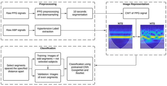 Our study leverages a dataset from the MIMIC database, consisting of PPG recordings and invasive blood pressure (BP) measurements. We employed deep learning (DL) models, specifically GoogLeNet, ResNet-18, and ResNet-50, for hypertension risk discrimination. Compared to previous works in the field, our methodology incorporates the use of CWT-based scalograms, which allow us to automatically extract deep features from PPG signals without the need for manual feature extraction [,]. This marks a departure from traditional machine learning-based approaches that rely on handcrafted features from PPG signals and ECG data.