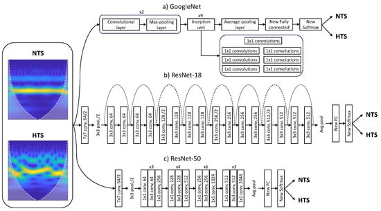 To retrain the pretrained networks, the last three layers were replaced to adapt the model to the new image dataset. These layers use image features and information from the previous convolutional layers to classify the input images. The original fully connected layers were replaced with new fully connected layers, with the same number of outputs as the number of classes, in this case, 2 (NTS or HTS). Similarly, the original softmax layer and the original classification layer were replaced with two new layers of the same type. Figure 3 illustrates the block diagram of the modified architectures of Googlenet and ResNet CNNs.