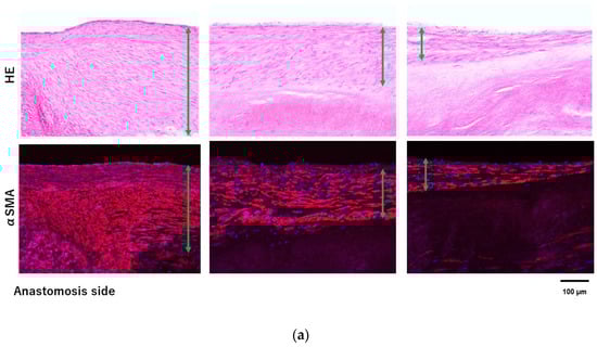Collagen, the main component of Biotubes, is useful as a biomaterial for tissue-engineered grafts because of its low antigenicity and high biocompatibility [,,,]. The pericardium is a commonly used restorative material in clinical aortic surgery today [,]. In this study, we compared the Biotube with autologous pericardium. We observed neogenesis of endothelial cells, smooth muscle cells, and elastic fibers from the native aorta along the Biotube at 6 months. Neoplastic cells, mainly smooth muscle cells, developed more around the anastomosis of the native aorta and the Biotube. These findings suggested that smooth muscle cells and fibroblasts are regenerated on the Biotube scaffold from the transection of the native aorta (Figure 7). The regeneration process of the Biotubes was no less favorable than in the autologous pericardium group. Similarly, the development of these neoplastic cells was observed in aortic valve neocuspidization models []. In contrast, there were endothelial cells on the luminal surface, even in the areas where smooth muscle cells were poorly developed. As for the development of endothelial cells, it is suggested that they occur not only from transection of the native aorta but also from blood. Endothelization has been reported from other tissue-engineered grafts [,]. At 6 months, there was insufficient smooth muscle cell neogenesis far from the anastomosis. However, we expect that the regenerative process will continue beyond 6 months, forming the vascular structure, based on our previous aortic valve study.