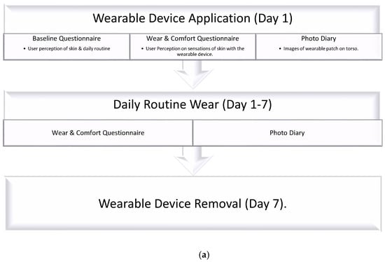 User perception and material integrity were evaluated using two different assessment tools: Likert scales and photo diaries. The resultant relationship between material properties and behavioral and mechanical implications was assessed over a 7-day timeframe. The volunteer group selected performed high-activity movements for a minimum of 2 h daily. This enabled insight into accelerated wear testing for mechanical failure of the wearable device from skin, as well as the impact of sweat and breathability beneath these wearable configurations. The location of the wearable devices, on the lower torso, was important for sensor signal acquisition in cardiovascular use–cases, where healthcare professionals have indicated the desired use of wearables within home settings.