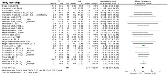 The meta-analysis and the statistical analysis were conducted using Review Manager software (RevMan 5.2; Cochrane Collaboration, Oxford, UK). A random effects meta-analysis was conducted to determine the effect of CT on body composition (body mass, fat mass, and muscle mass), cardiorespiratory fitness (VO2max, anaerobic threshold, aerobic performance and MAS/MAP), and strength (upper and lower limb 1-RM, handgrip, and CMJ height). Effect sizes of outcomes between training and control arms, as well as the differences before and after training intervention, were calculated as the (adjusted Hedges’ g) standardized mean difference (SMD = ) with mean ± SD and 95% confidence intervals.