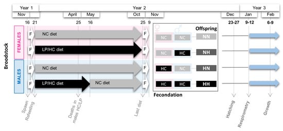 During the spawning period (November—year 2), spawns from 3 NC females and 2 HC/LP females were cross-fertilized with milts from 4 males from each experimental condition (NC and HC/LP diets). Thus, offspring from 4 different conditions were obtained: NN, fry from both males and females fed the control diet; HN, fry from only females fed the HC/LP diet and males fed the control NC diet; NH, fry from only males fed the HC/LP diet and females fed the NC diet; and HH, fry from both parents fed the HC/LP diet (Figure 1).