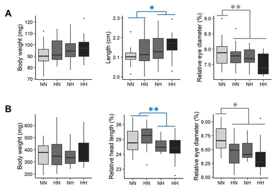 After 3 weeks of feeding, fry weighed 362.41 ± 106.75 mg (Figure 2B). No significant differences were detected in fry body morphologies (i.e., for BW, K, L and D). However, the head proportions of NH and HH fry were on average 2.44% lower than those of HN and NN fry ( = 10.7, df = 1, p = 0.001). Moreover, the eye proportions of HN, NH, and HH fry were 1.62, 1.93 and 4.94% lower, respectively, than those of NN fry ( = 4.9, df = 1, p = 0.03) (Figure 2B).