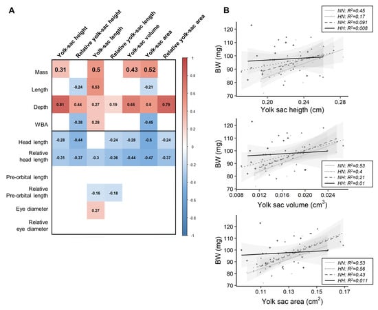 Before the first feeding, phenotypical traits related to the body (BW, K, L, D, and WBA) and head (HL, HLr, POLr, and ED) morphologies were correlated with different yolk-sac traits (Figure 3A). All but three of these relationships remained unaffected by the parental nutrition. The relationships linking BW and yolk-sac length, volume, and area were significantly different for HH fry in comparison to those for NN fry (Figure 3B). While NN fry body mass was positively correlated with YSH, VYS and YSA, such correlations did not exist for HH fry.