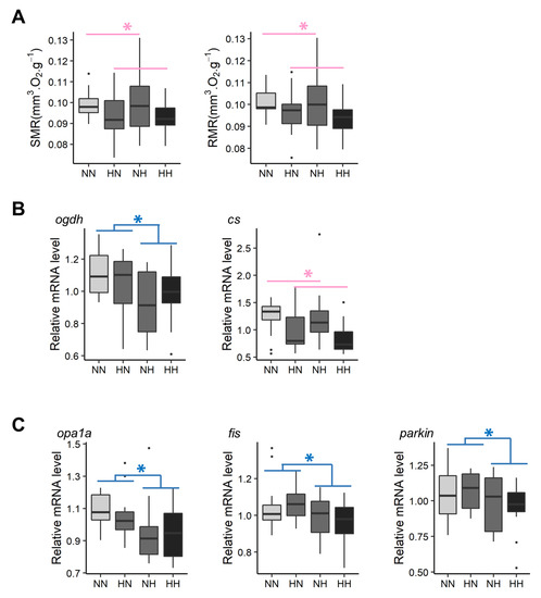 Pathways related to metabolism included genes coding for glucose transporters and genes involved in glycolysis and amino acid metabolism, energy production, and mitochondrial dynamism. Hence, these pathways were selected to be further analyzed by qPCR, thereby allowing for the validation of microarray data (Figure S2). Thus, HN and HH fry had, on average, 13.6% and 14.6% higher hk2 and pfkla mRNA levels, respectively, when compared with those of NH and NN fry. On average, NH and HH fry had significantly lower glut1ba (−14.8%), glut1bb (−9.4%), pfkmaa (−19.5%), pfkmab (−26.8%), pfkmba (−39.3%), and pfkmbb (−21.9%) mRNA levels than those of HN and NN fry. HN fry had significantly higher ldhaa mRNA levels than those of the fry from the three other conditions. Results regarding genes coding for glucose transporters and the 6-phosphofructokinase are in accordance with results obtained by the transcriptomes analyses. In regard to amino acid catabolism, NH and HH had, on average, significantly lower hibadh mRNA levels than those of NN and HN fry (−18.6%). In contrast, no differences in the levels of mRNA for genes coding for the glutamine synthetase and glutaminase were detected among all conditions, which is in contrast with results obtained from the transcriptomic analyses. Regarding energy production, mRNA levels from one of the three homologs coding for the citrate synthase were decreased in HN and HH fry in comparison with those of NN and NH (−26.1%). Moreover, mRNA levels for one of the three homologs coding for 2-oxoglutarate dehydrogenase decreased by −11.1% in NH and HH fry when compared with the levels recorded for NN and HN (Figure 4B). Together, these results are in accordance with the transcriptomic analyses. Interestingly, the comparison of transcriptomes also revealed some effects of the parental HC/LP diet on mitochondrial dynamism (bnip3 and mfn2). qPCR results did not confirm the results obtained for mitofusin 2 (mfn2). NH fry tended to have a lower bnip3a mRNA level than that of NN fry. Moreover, NH and HH fry had, on average, significantly lower opa1a (−10.4%), fis (−8.4%), and parkin (−9.1%) mRNA levels than those of NN and HN fry (Figure 4C).