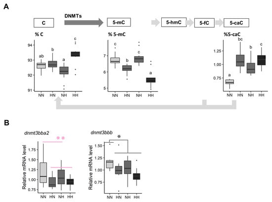 The five intermediates of DNA methylation were measured in whole fry between 61 and 64 dpf (Figure 5A). The C proportion was significantly decreased in HN and HH in comparison to the C proportion observed in NN fry ( = 12.2, df = 1, p < 0.001). The 5-mC proportion was 8.3% and 16.8% lower in HN and HH fry, respectively, in comparison to that observed in NN fry ( = 9.3, df = 1, p = 0.002). The 5-hmC and 5-fC were not detected by HPLC-UV in our samples. Finally, the 5-caC proportion significantly increased in HN, NH, and HH fry in comparison to that observed in NN fry ( = 11.9, df = 1, p < 0.001).