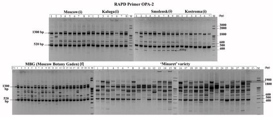 Some primers amplified fragments that were common for all analysed plants (RAPD: OPA-2—1300 bp and 520 bp, QR-5—730 bp, 450–850 bp; ISSR: MS1—400 bp; REMAP: MS4+TarI—210 bp, MS2+Thv19—170 bp). These fragments may represent nucleotide sequences specific to L. polyphyllus. Other primers amplified fragments specific for groups of plants (RAPD: OPA-2–large (about 2000 bp) fragments from the DNA of most plants of the ‘Minaret’ variety; a 400 bp fragment specific for Smolensk region plants; QR-5–1450; and 1500 bp fragments from the ‘Minaret’ variety; REMAP: MS7+Wis–900 bp from the feral population at MBG). Such fragments may be of interest as markers for those populations (Figure 1).