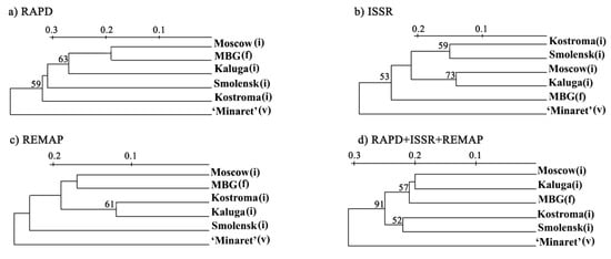 Phylogenetic trees were built using individual methods (RAPD, ISSR, REMAP) and all methods combined (Figure 5).