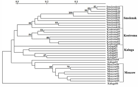 Regardless of the method used, the ‘Minaret’ variety was considerably different from the other populations. RAPD and REMAP clustered together populations from the Moscow region and the feral population at MBG (Figure 2a,c). However, ISSR clustered Moscow and Kaluga region populations (Figure 2b). Altogether, the methods clustered the populations from Moscow and Kaluga regions with the feral MBG population; they also clustered Smolensk and Kostroma populations. This clustering almost reflects the geography of the populations. The Moscow Smolensk and Kaluga regions border each other, but the Kostroma region is far from them. The ‘Minaret’ variety was separated from these clusters (Figure 2).