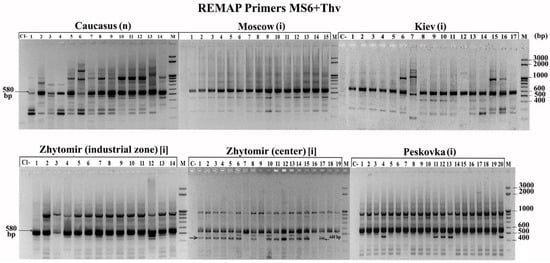 In hogweed, in contrast to lupin, only a few primers amplified monomorphic fragments typical for all plants and some populations (RAPD: QR-1—900 bp, QR-2—590 and 800 bp; ISSR: MS1—1500 bp; REMAP: MS6 + Thv19—580 bp). Interestingly, with primers MS6 + Thv19, a 440 bp fragment was detected, which is characteristic of plants growing in the centre of Zhytomir but absent in plants of the industrial zone of Zhytomyr (Figure 4).