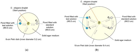 Schematic of PASS plates described in Section 2.2. (a) A ⌀6-cm PASS plate with two ponds, T1 for test solution and C1 for standard (control) solution. (b) A ⌀10-cm PASS plate with four ponds, T1 and T2 for test solution and C1 and C2 for standard solution.