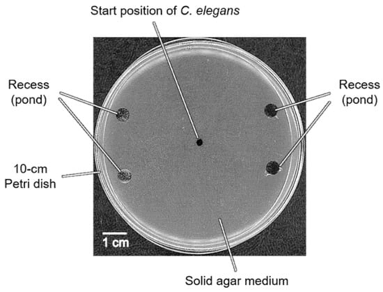 The nematode Caenorhabditis elegans is a well-established model organism for investigating vital mechanisms, such as neural behaviors, development, and aging [,]. The animal shows sensory responses, so-called “taxis”, to specific chemicals (chemotaxis) [,,,,,,,,,,,,,,,,,,,,,,,] and/or temperatures (thermotaxis) [,] and its associative learning [,,,]. In a chemotaxis assay, a concentration gradient of the test substance is formed on one side of an agar plate. To test chemotaxis with substances with an odor, the test solution is dropped on one side and the standard solution is spotted onto the other side as a control. To prevent the animals from moving out of the attractant area over time, an anesthesia, such as sodium azide, is added dropwise to both sides of the plate and the mixtures are then dried. However, it takes time to dry the test solution and the anesthesia, and the diffusion of the anesthesia over time affects the evaluation of the response to the substance being tested. In particular, when the animals enter the area where the anesthesia has been dropped, they cannot escape and are then trapped. This phenomenon makes an accurate response evaluation difficult and the factual nature of the conclusions cannot be guaranteed. Furthermore, animals are often affected by adaptation to chemical substances and associative learning over time, thus there is an additional problem that the results can vary from trial to trial due to the effects of anesthesia and adaptation.