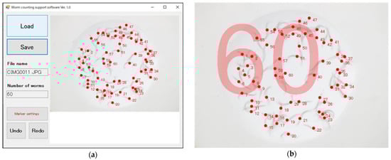 Overview of software to facilitate worm counting. (a) The screen of this software after counting has been completed. In the manual counting with this software, we load an image of C. elegans individuals trapped in a pond. A red circle as a marker and a serial number are presented by clicking on each body. (b) An image after counting all animals trapped in a pond. The total number of animals, 60 in this example, is presented.