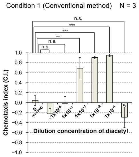 Results of conventional assay to evaluate chemotaxis of C. elegans to a graded series of concentrations of diacetyl. Three independent assays were performed under condition 1 in Table 1. The maximum concentration of diacetyl was 1 (undiluted solution) and the minimum diluted concentration was 1 × 10−5. Light- charcoal bar and error bar represent the mean and SEM of the chemotaxis index (C.I.) of three assays under the same condition. C.I. = (the number of animals in the test area − the number of animals in the control area)/(the number of animals in the test area + the number of animals in the control area). All data were analyzed by one-way ANOVA at p < 0.05, p < 0.01 (**), and p < 0.001 (***) significance levels by comparison to the control group. n.s., not significant; N, the number of assays. The details of the p-values are shown in Table S1.