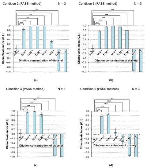 As shown in Figure 6c, the results showed the same tendency as those for PASS under condition 2 in Section 3.3.1, but the value of C.I. with 10−2 dilution was lower (see Table S1 for p-values). It is suggested that diacetyl is more likely to volatilize when diluted with ultrapure water than when diluted with wash buffer solution. The gelatin-based wash buffer solution used in conditions 2 and 3 has been reported to have a moisturizing effect [], and it is considered that evaporation is slightly suppressed compared with that with ultrapure water. As a result, the concentration of diacetyl in air under condition 4 with ultrapure water was slightly higher than that in condition 2, and the number of animals that escaped from ponds filled with diacetyl solution with 10−2 dilution increased.