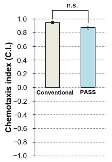 Statistical analysis was performed on data from more than three independent trials of the chemotaxis assay. The significance of differences between each of the concentration and control groups was analyzed by one-way analysis of variance (ANOVA), except for the chemotaxis assay to NaCl. p < 0.001, p < 0.01, or p < 0.05 was considered significant. Note that the data with no variance were excluded from the analysis. In the chemotaxis assay to NaCl, after confirming the homoscedasticity using F-test, the significance of differences between the conventional method and PASS method was examined using Student’s t-test. Here, p < 0.05 was considered significant. Numerical values are presented as values with standard errors of the mean (SEM). All statistical analyses were performed using Microsoft Excel software (Microsoft, Redmond, WA, USA).