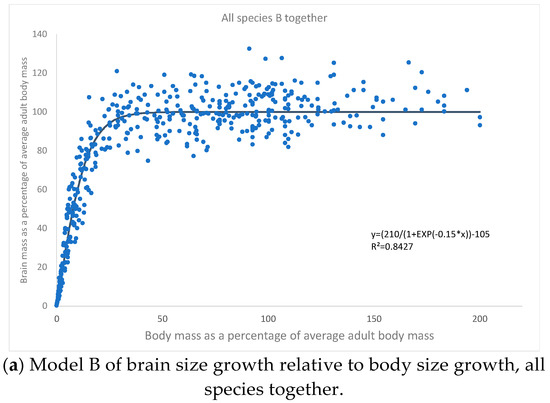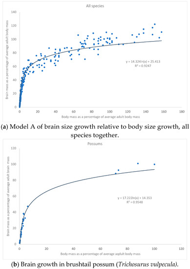 We studied the growth of brain size compared to body size, both standardized on adult (final) values. This approach provides for the comparability of animals of very different brain sizes and body sizes. Two kinds of curves fitted the data sets: they were either logarithmic or logistic. All other types of regression gave poorer fits. Therefore, two types of brain growth patterns could be discerned: “Model A” and “Model B” (Figure 1a and Figure 2a).