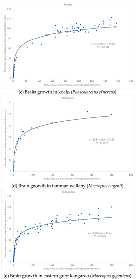 A recent study by Todorov et al. emphasizes that reproductive strategies and maternal investments can significantly shape the size of marsupials’ brains [27]. However, knowledge of marsupial ontogenetic brain/body size allometry is limited. Consequently, this study explores brain/body ontogenetic growth in marsupials and compares it with placental mammals.
